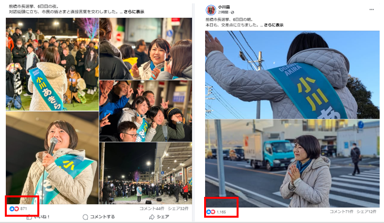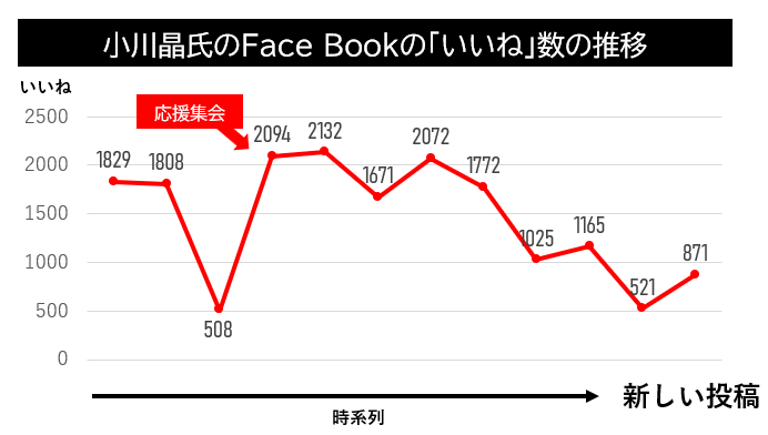 一方の丸山彬氏はFaceBookのフォロワー数も投稿数も少ないため、比較はできないが、いいねの数は直近で86→345→84。メディアでの露出度が違うため、これをもって、丸山支持者が少ないとは言えない。むしろ、丸山候補が出てきた辺りから、小川候補の「いいね」の数も下降傾向にあるという動きから、小川支持者の一定数が丸山氏を含む別の候補に流れているとみるべきだろう。