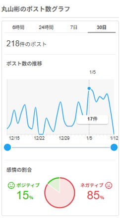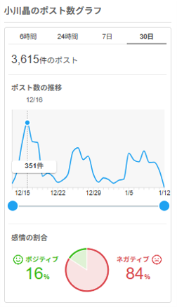 SNSのトレンド分析でもネットで小川氏がいい意味でも悪い意味でも話題性があることを裏付けている。過去1か月の投稿数は3,600件超。話題性は丸山氏の十数倍だ。
