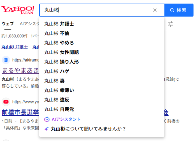 一方、「丸山彬」では、「不倫」「操り人形」「女性問題」。