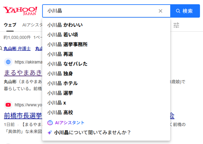 検索ワード「小川晶」で出てくるのは、「かわいい」「若い頃」「なぜバレた」。