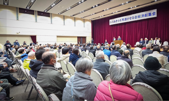 小川氏の集会では、白髪の参加者が多く、それほどではないが空席もある。