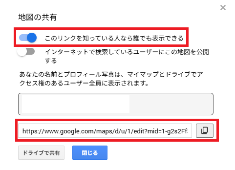 社員間で共有したり、別のデバイスで表示させる場合は、「誰でも表示できる」をONにしておく。そして、発行された地図のURLを送る。