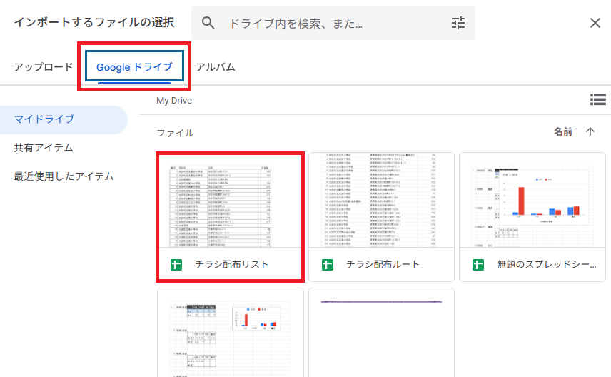 今回はスプレッドシートを使ったので、「Googleドライブ」のタグを選び、該当のファイルをインポートした。自分のPCに保存されたExcelのデータを使う場合はアップロードボタンからインポートする。