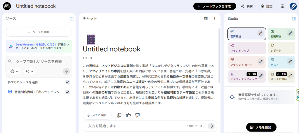 ということで、実際にNotebookLMを使って、音声解説をつくってみました。